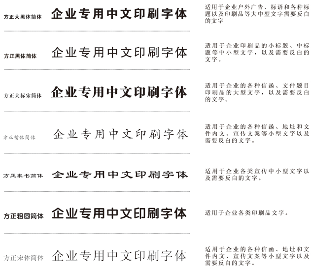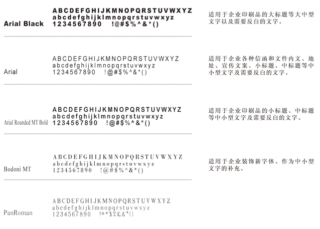 為使視覺形象更加統(tǒng)一,所有傳媒所用文字,均應(yīng)選用以下規(guī)定字體。字體允許向右傾斜20度,允許長體90%―100%,扁體110%-120%。禁止使用其他字體,特性情況(如節(jié)日、慶典)設(shè)計例外。同時,為求得運用方便,在刊物,媒體及封面的排版上,若無相同字體時,可選擇字形相近的字體替代使用。