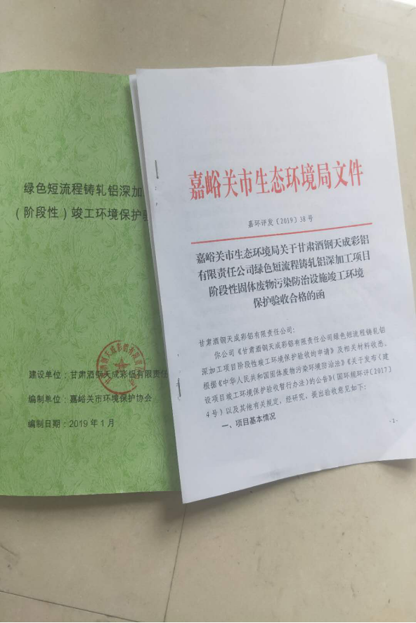 我公司環境影響報告書均通過省生態環境廳與市生態環境局審批,于2016年11月2日取得《嘉峪關市環境保護局關于酒鋼天成彩鋁有限責任公司綠色短流程鑄軋鋁深加工項目環境影響報告書的批復》嘉環評【2016】132號。并在2019年3月4日通過環保建設項目“三同時”(階段性)驗收,并取得環境保護驗收合格函。