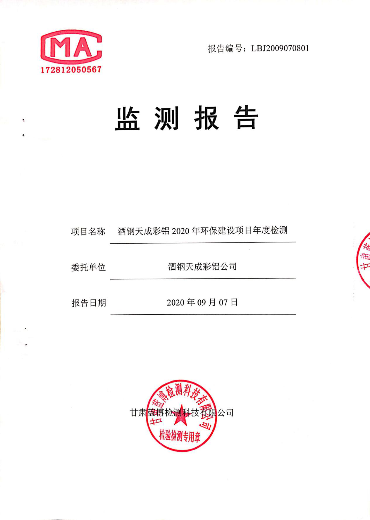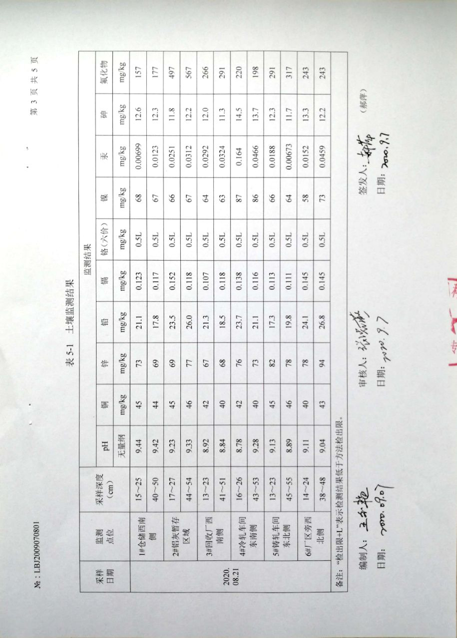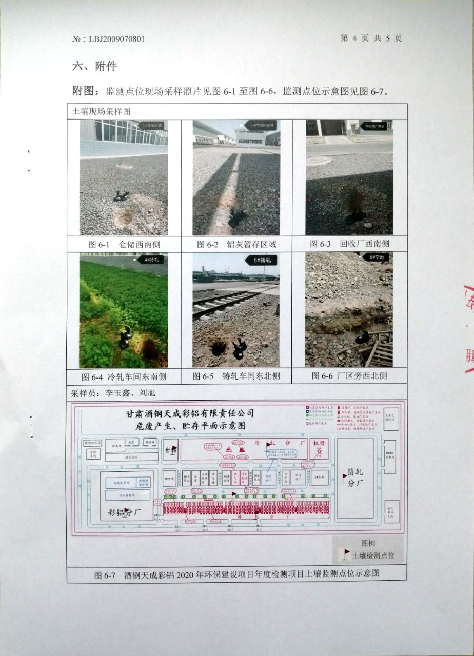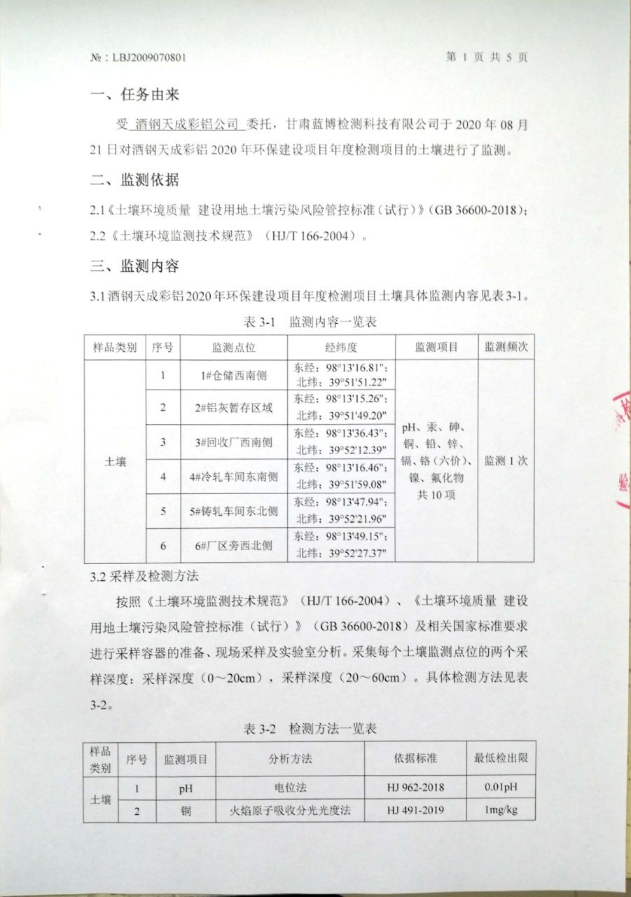 | 監(jiān)測(cè)數(shù)據(jù) | 詳見甘肅酒鋼天成彩鋁有限責(zé)任公司2020年土壤環(huán)境檢測(cè)報(bào)告,批號(hào):LBJ2009070801 | |||