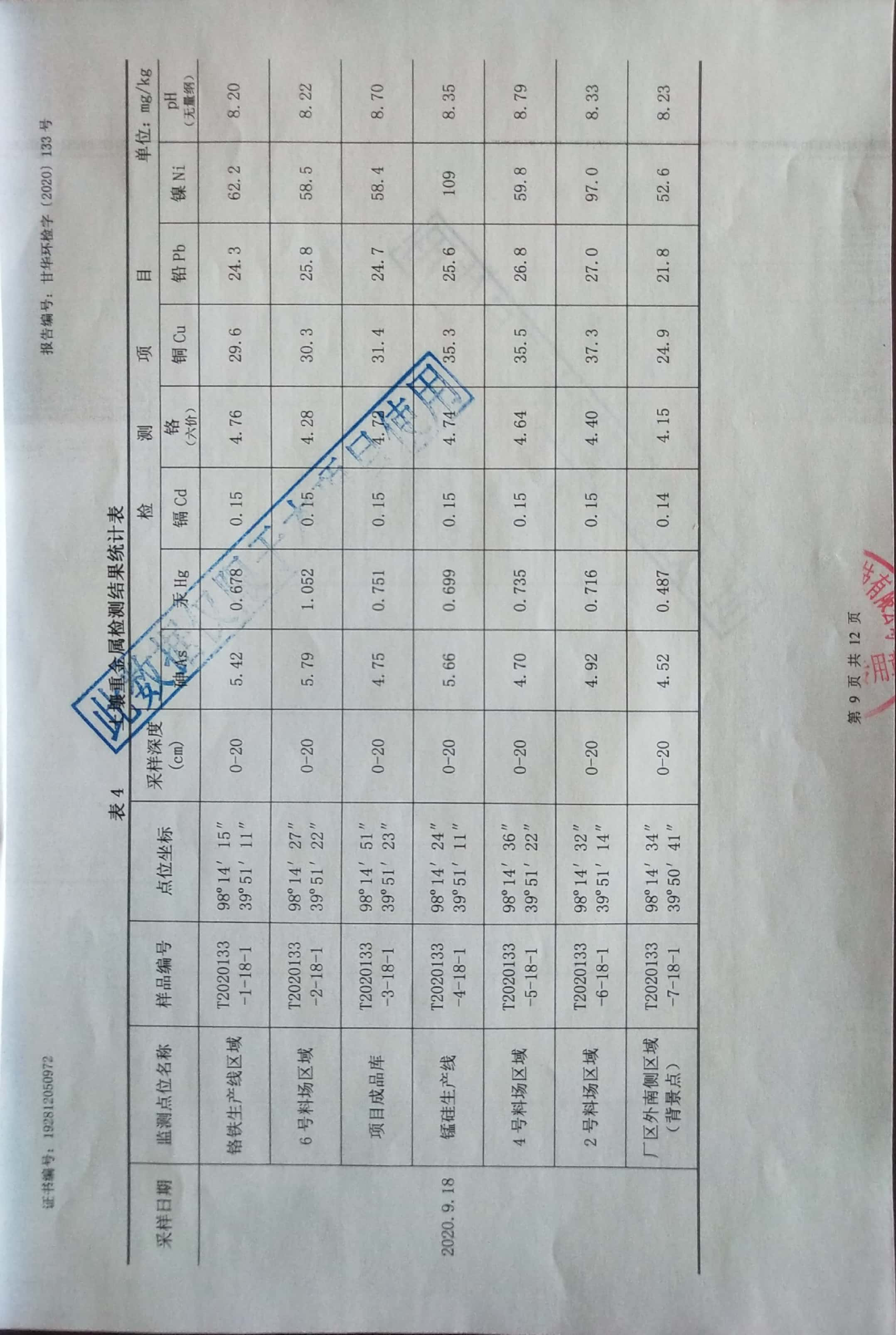 | 監測時間 | 2020年9月18日 | 監測項目 | PH、鎘、汞、砷、銅、鉛、鉻、鎳、鋅、陽離子交換量 | |
