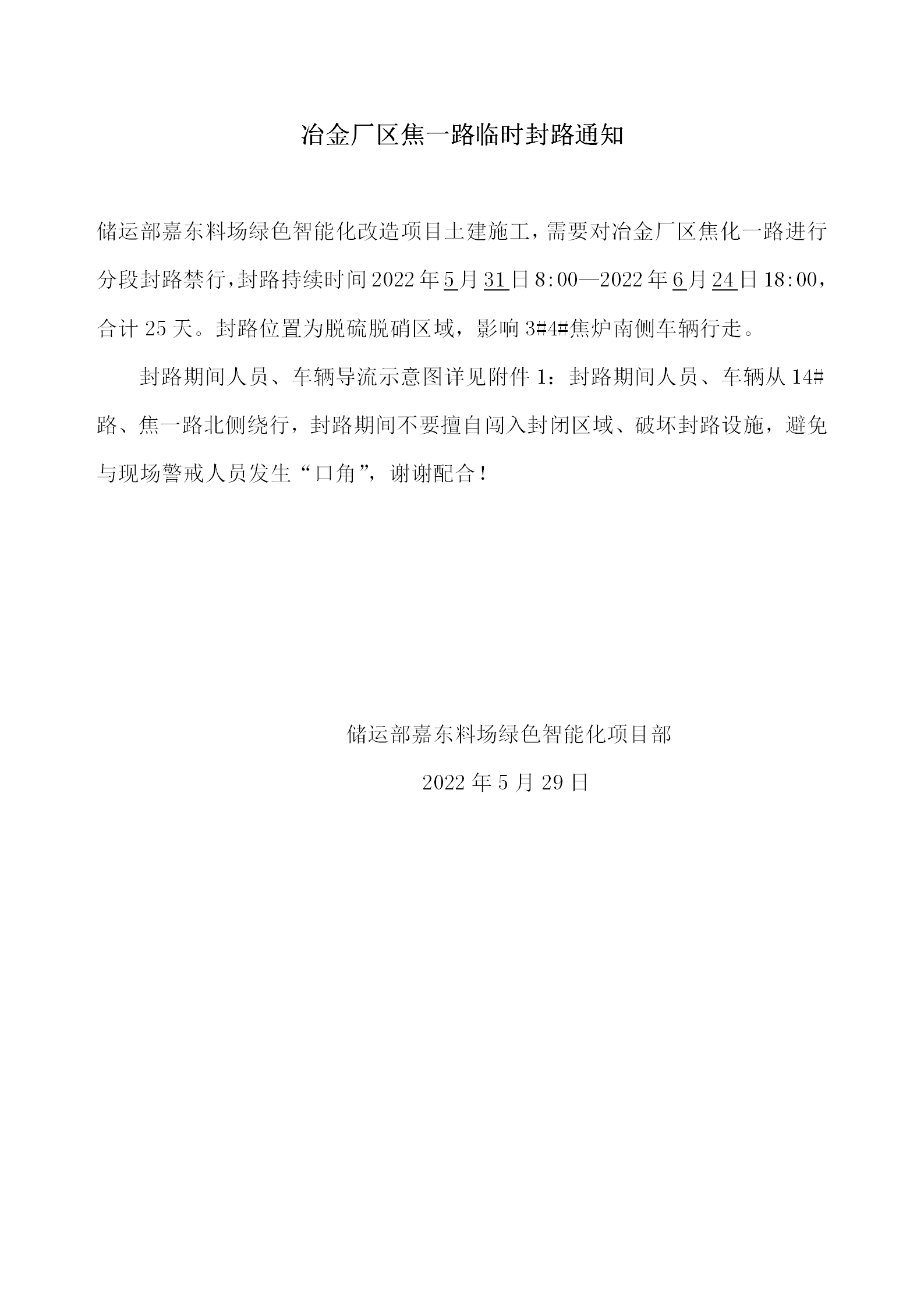 冶金廠區焦一路臨時封路通知