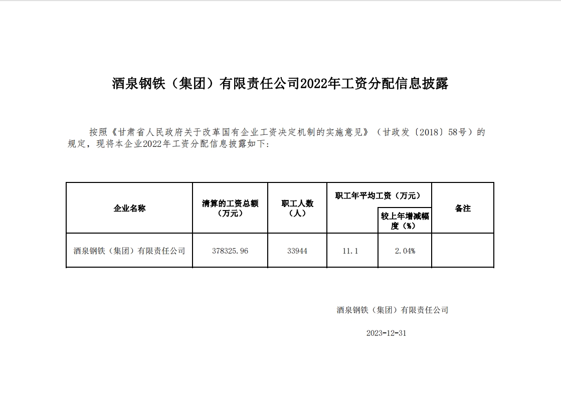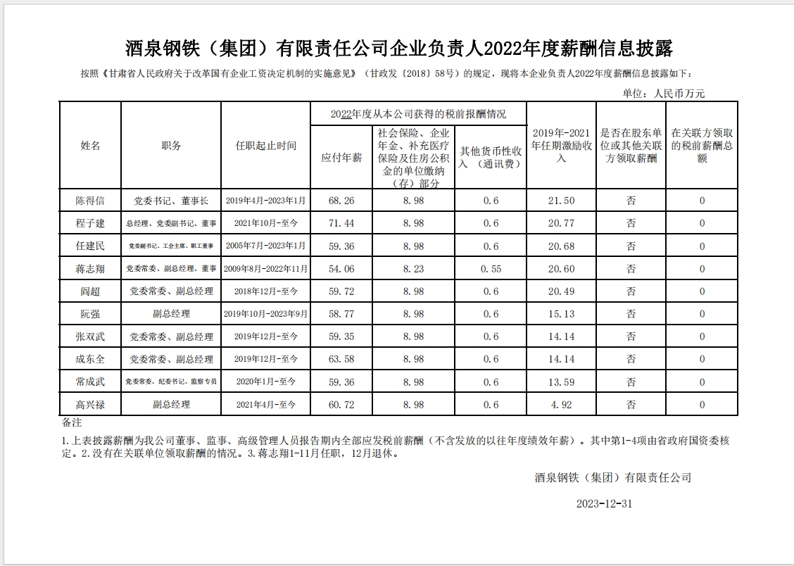 酒泉鋼鐵(集團)有限責任公司2022年工資分配及企業負責人2022年度薪酬信息披露